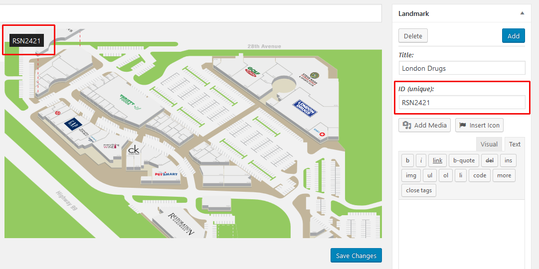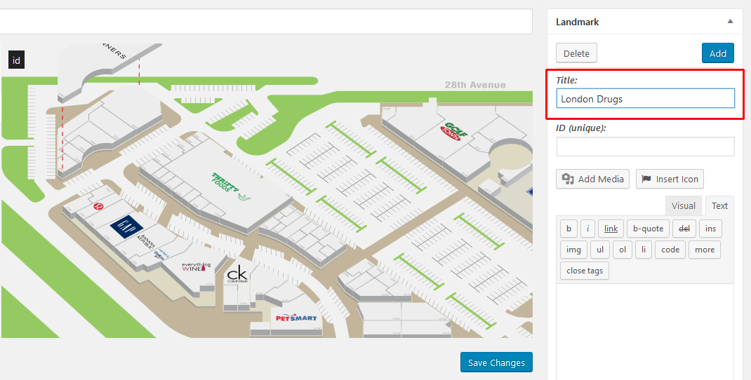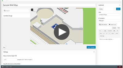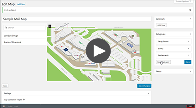Go to Store Maps > Maps and click on the map of your mall. We have already put your map into WordPress and customized it for your use. All you need to do is add the categories and all of the landmarks (stores).