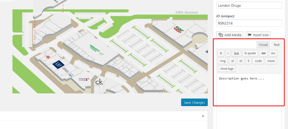 Please note that clicking the “Save” button in the right column will save the content but it will only appear on the map once you click the “Save Changes” button.