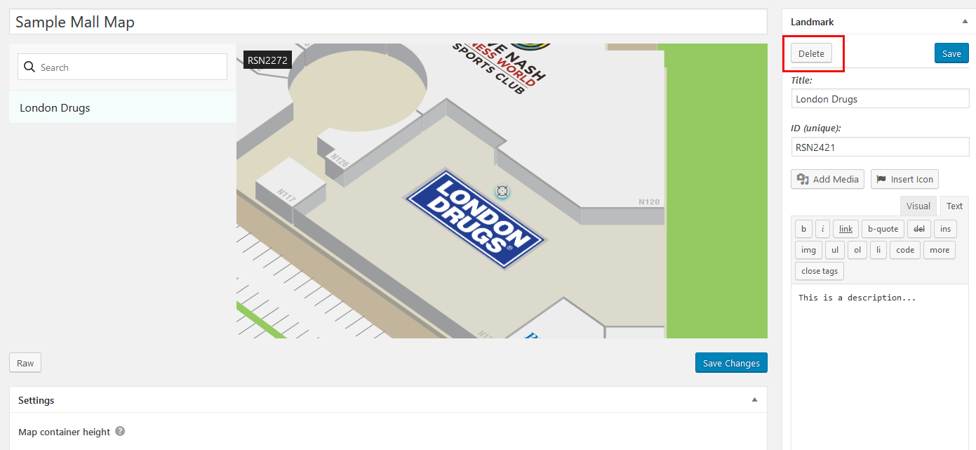 Delete Stores on Mall Map Created April 9, 2019 Author uberadmin Category Mall Map Deleting stores on your Mall map is a simple, two-step process. Click on the store you want to edit – either the store name or on the map. That will bring up all of the previous info that was entered into the Landmark box. 1. Click the delete button. 2. Then click the “Save Changes” button.