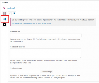 To access the Facebook page within the Yoast Meta Box, click on the share icon shown in the image below. Once there fill in the Facebook Title, Description and choose an image to represent the page.