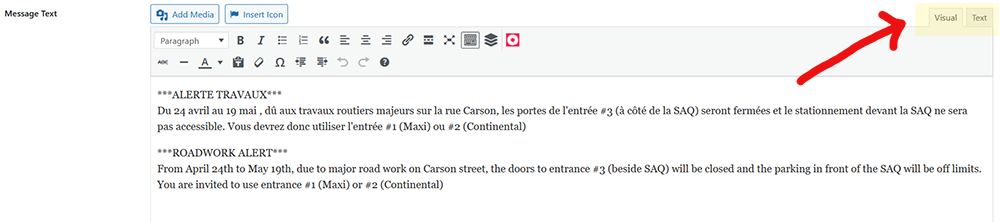 2. Add the Content – On the WP Notification Bar Settings page, in the “Message Text” field, change the tab from “Text” to “Visual”, and then enter the message content into the box: