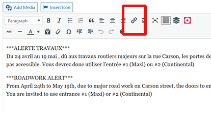 If you want to include a link to the text, highlight the text that you want to turn into the link and then click the “Link” button in the toolbar. Then follow the instructions to paste the URL into the field that appears.