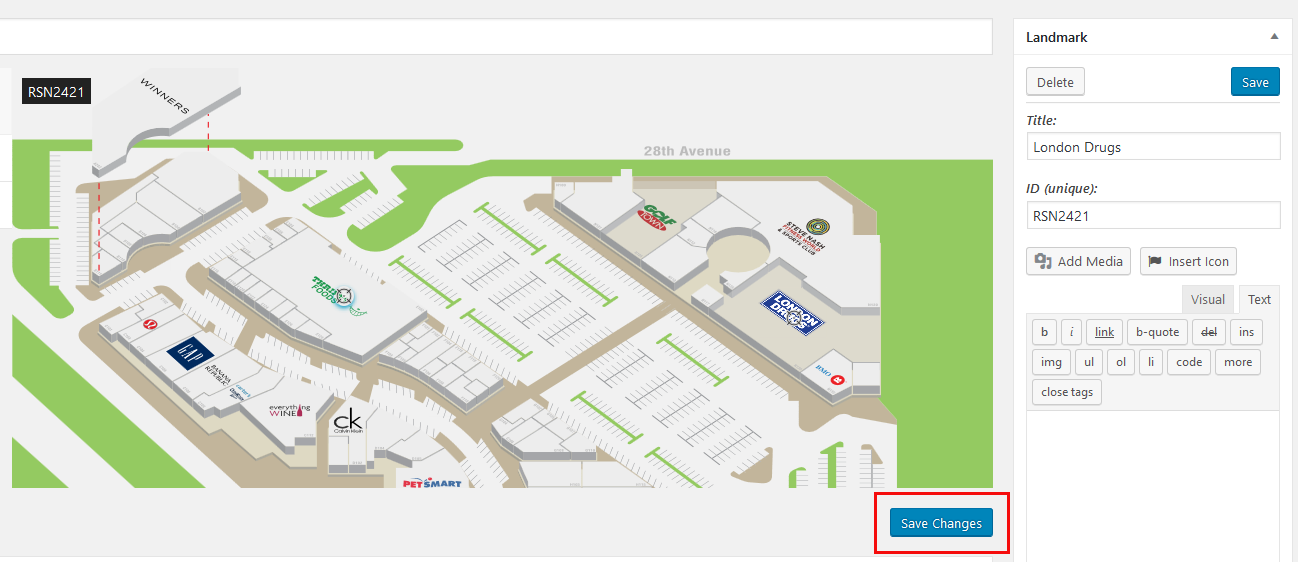 Go to Store Maps > Maps and click on the map of your mall. Once you are on the map page, click on the store you want to edit – either the store name or on the map. That will bring up all of the previous info that was entered into the Landmark box.