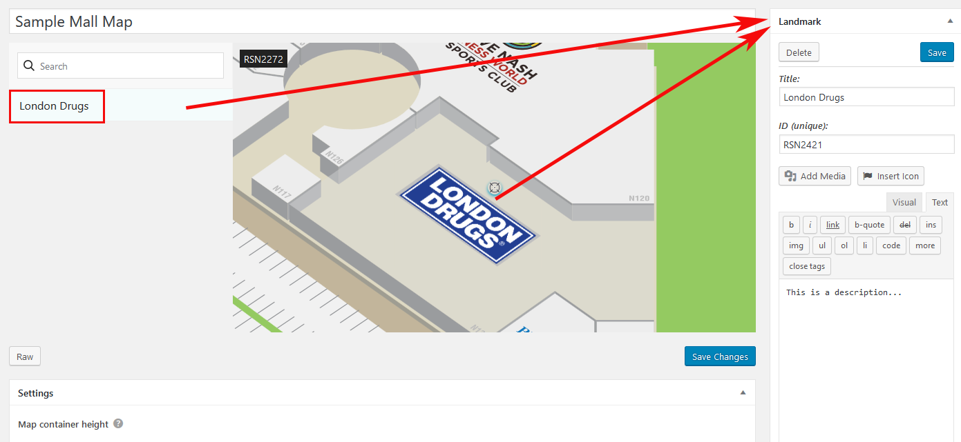 Please note that clicking the “Save” button in the right column will save the content but it will only appear on the map once you click the “Save Changes” button.