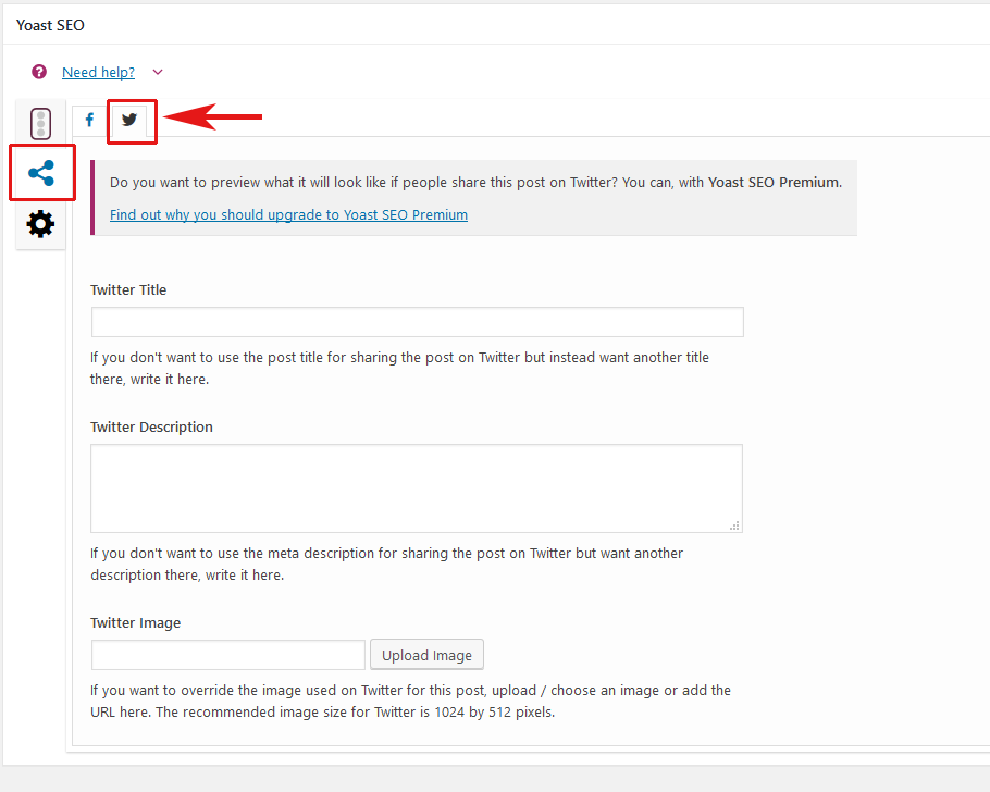 To access the Twitter page within the Yoast Meta Box, click on the share icon shown in the image below and then click the Twitter tab. Once there fill in the Twitter Title, Description and choose an image to represent the page.