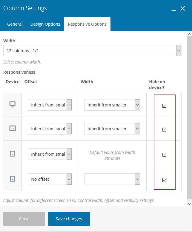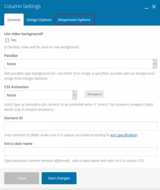 3. Then in the new “Column Settings” dialogue box that pops up, select the “Responsive Options” tab.