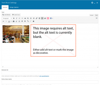 If you don’t remember to enter in the alt tag, the site’s accessibility plugin will give you a very big reminder! If this happens simply delete both images and insert your image again with the alt tag to make the reminder go away.