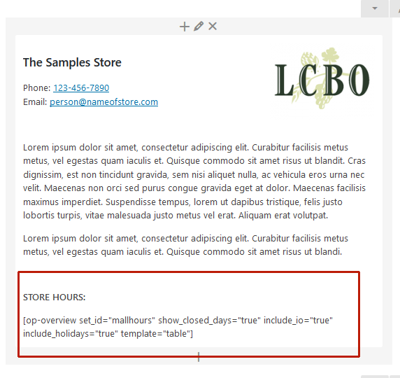 Once you have saved the store hours, the next thing you need to do is to add the Store hours to the Store page. To do this go to the store that you want to edit. Where you see the following code (see below), change “mallhours” to whatever you entered for your set alias.