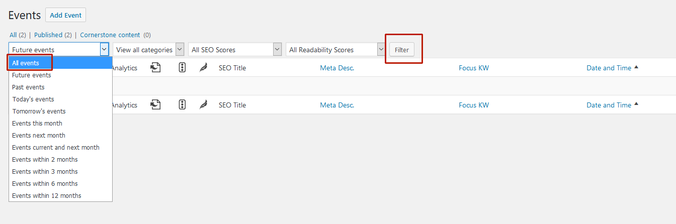 View All Events (Past & Present) Created April 2, 2019 Author uberadmin Category Sales & Events The All Events page automatically defaults to show you Future Events only, but sometimes it is helpful to view a past event. To view all events (past and present), select “All Events” from the dropdown menu and then click the “Filter” button.